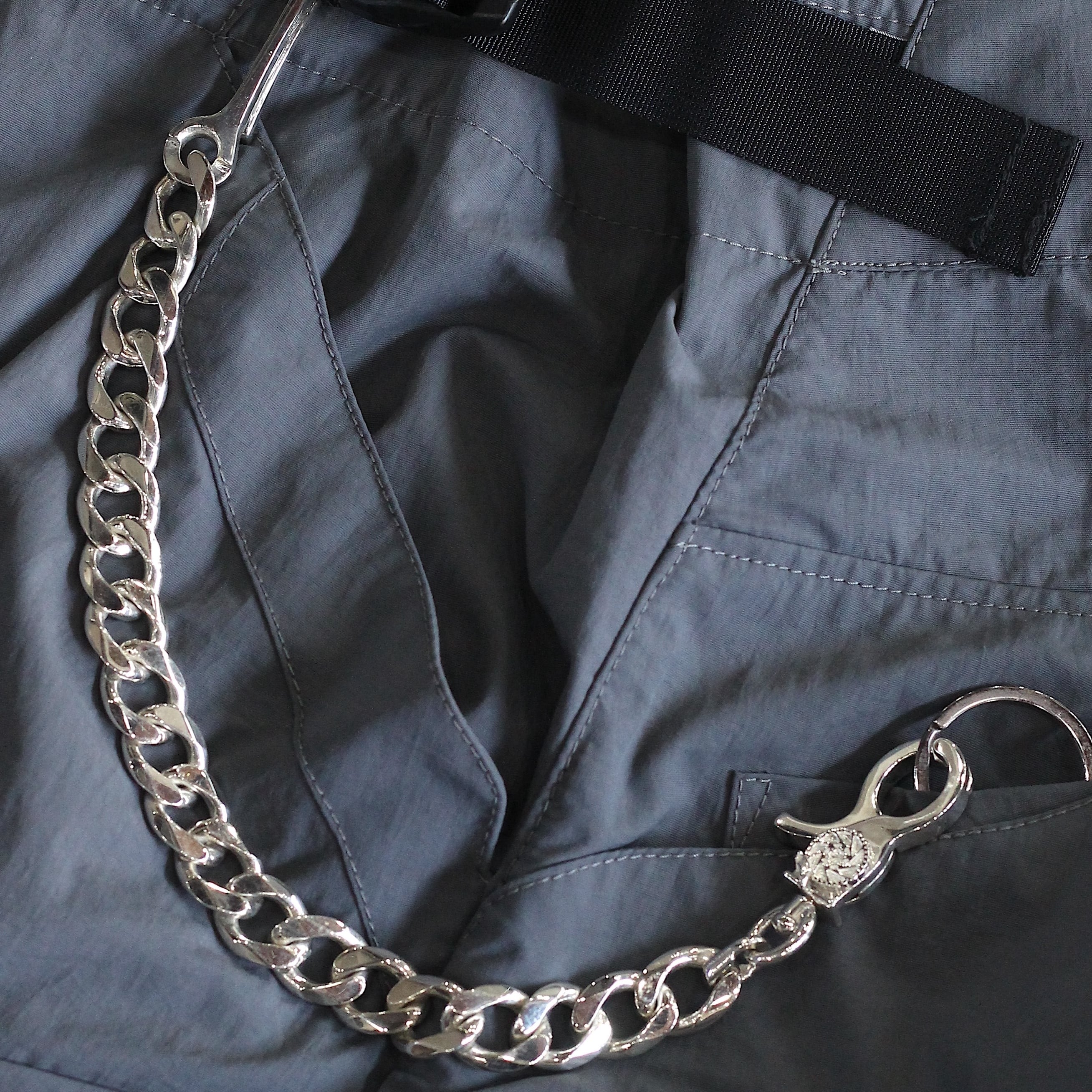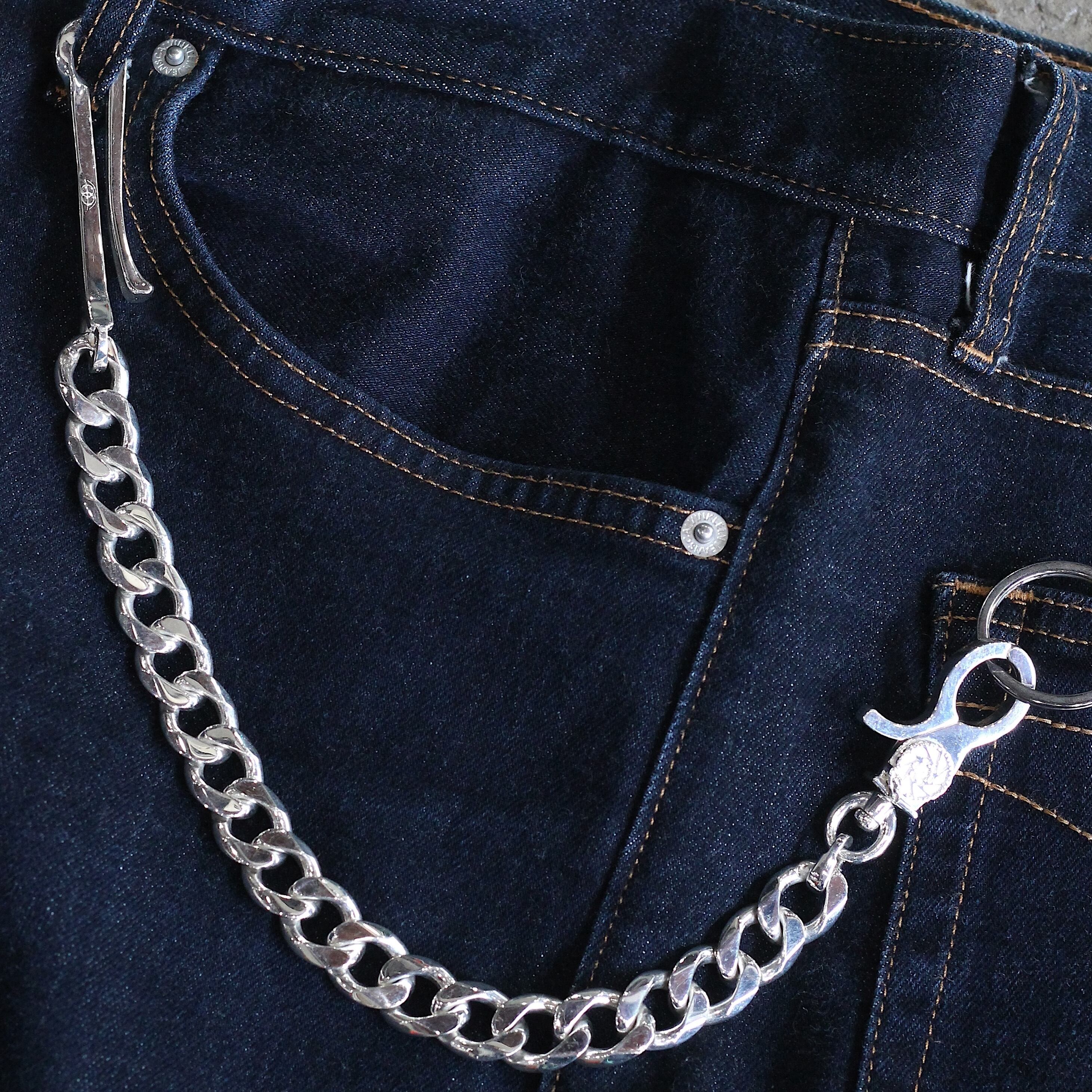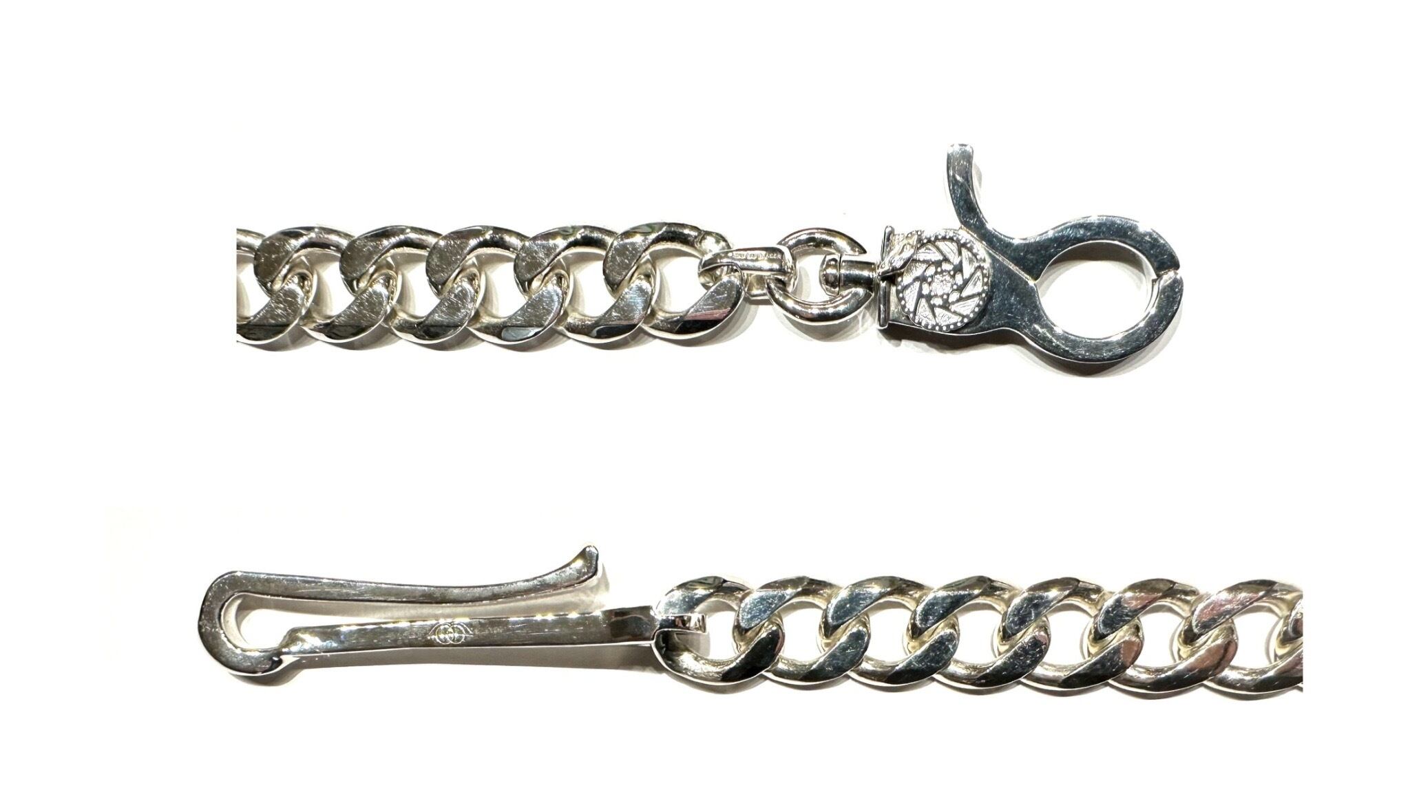COVEより満を持してリリースされたオリジナルウォレットチェーンです。名だたるブランドのジュエリーを手がける世界的デザイナー "KOTA OKUDA"氏に製作を依頼し既存の型を一切使用せず完全ワンオフ仕様で仕上げられています。フック部は、一般的なウォレットチェーンより一回りシャープに整えワンポイントで捻りを加えています。カラビナ部は、数十枚のブレーキディスクデザインを元にこの世に無いオリジナルデザインでカシメ部を仕上げていただきキャリパーも同様に体現。クリップの開閉時には回転し実際の動きとシンクロします。チェーン部はイタリア製の希少な美しい8面カットを採用し、引っ掛かりや絡まりを解消。そして1番こだわったと言っても過言ではないチェーンとフック/クリップ部を繋ぐクラスプも勿論一から製作しており、ブランドコンセプトが極小刻印されています。チェーンの中ではかなり短い仕上がりで使用時の主張は控えめですが、年を重ねて服の趣味嗜好が変化しても寄り添えるものに。